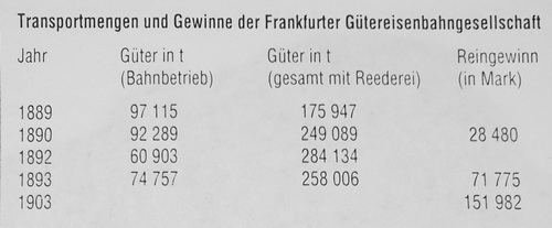 573 500 Mark.Die Bahn nannte sich fortan "Frankfurter Gütereisenbahngesellschaft". Mit dem Ziel den Umschlagbetrieb zu heben, stieg die Gütereisenbahn nun auch in das Geschäft des Schiffstransports ein. Man erwarb die Stettiner Dampfschleppschifffahrts-Aktiengesellschaft mit allem Zubehör. Die Frankfurter besaßen nun die kombinierten Personen- und Schleppdampfer LÖWE, KÜSTRIN, PRINZ CARL und ADLER, 17 Schleppkähne sowie für den Eisenbahn- und Umschlagbetrieb zwei Lokomotiven, zwei Dampfkräne und einen Handkran. Zusätzlich hatte die Gesellschaft im Jahr 1884 mit der Oder-Dampfschiffahrts-Gesellschaft ein Betriebsabkommen abgeschlossen, womit sich der nutzbare Transportraum weiter erhöhte. Da sich der Schwerpunkt der Wassertransportgeschäfte in Breslau befand, wurde der Direktionssitz Anfang 1885 von Frankfurt (Oder) dorthin verlegt. Im Geschäftsbericht für das Jahr 1903 wurden für das Unternehmen 120 Schiffseinheiten, darunter 23 Dampfer, 40 eiserne und 48 hölzerne Kähne ausgewiesen.