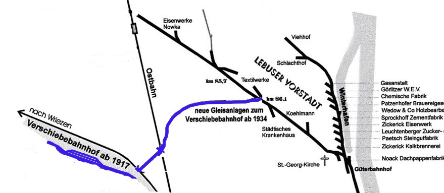 Mit der Inbetriebnahme der neuen Anlage endete die alte Strecke zum Haltepunkt Grube Vaterland mit einem Prellbock vor den Gleisen der Strecke nach Küstrin.