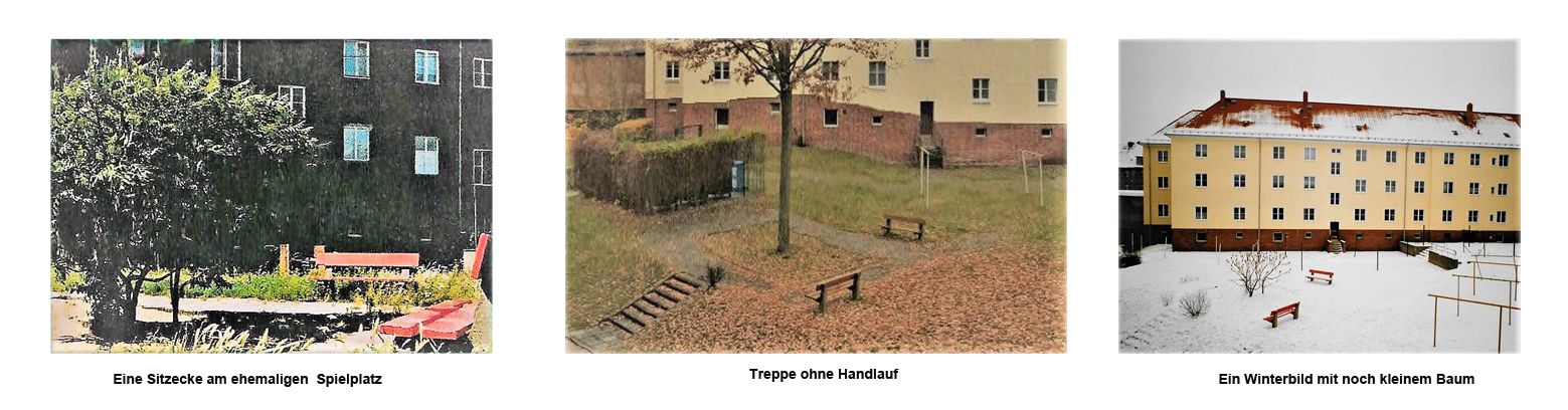 Auf der Fläche hinter unserem Haus waren entsprechend dem Projekt ein Kinderspielplatz hinter Haus 61 und ein weiterer hinter Haus 57 eingerichtet worden. Der Sand aus den Spielkästen musste jährlich gewechselt werden. Weil ein Kraftfahrzeug den Weg dorthin nicht passieren konnte, habe ich den Sand hinter Haus 61 so weit transportiert, dass er mit einem Fahrzeug problemlos abgefahren werden konnte. Dennoch wurde der Spielplatz zwei Jahre später gesperrt. Daraufhin bepflanzte ich die Fläche mit Blumen. Schließlich erhielt ich vom Lokführer Bernhard Küste aus Haus 62 eine kleine Eiche, der er den Namen seines Sohnes „Denise“ gab. Die Eiche wuchs nun auf dem ehemaligen Spielplatz zu einem prächtigen Baum heran. Vom VEB Grünanlagen habe ich die Genehmigung erhalten, um die Eiche zwei Sitzbänke aufzustellen. Die Stützeinrichtungen erhielt ich vom Frankfurter Friedhof und die Sitzflächen aus Holz vom Bahnbetriebswerk.