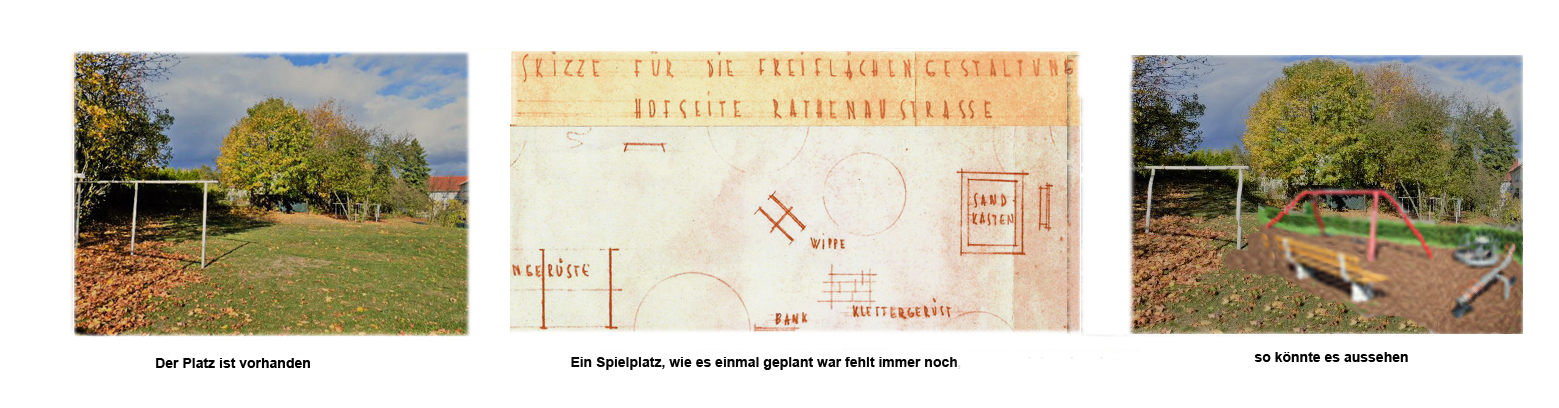 Die vermauerten Platten für den zweiten Spielplatz waren kurz nach der Sperrung geplündert worden. Daher ließen sich hier keine Bänke aufstellen. Dennoch sollte diese Fläche wieder als ein Spielplatz mit Schaukel und Klettergerüst für die Kinder nutzbar gemacht werden.